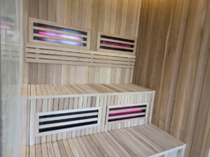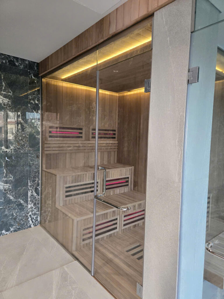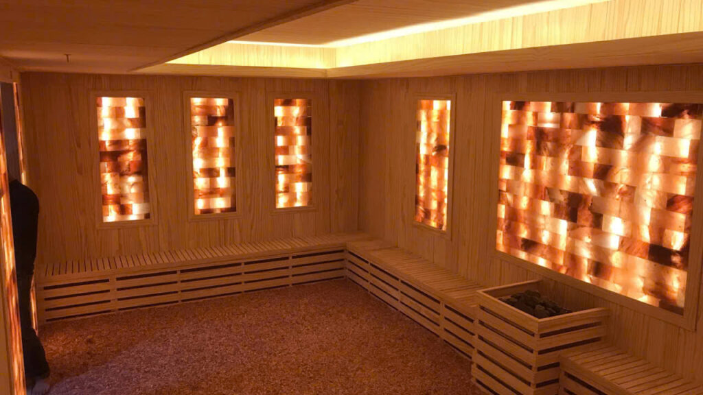 Phòng xông hơi sauna được làm nóng từ máy xông hơi khô và đá xông với nhiệt độ trong phòng lên tới 70 độ C, độ ẩm 10%. Bên trong phòng bố trí đầy đủ phụ kiện xông hơi như đèn, xô gáo gỗ, ẩm nhiệt kế, đồng hồ cát… tạo cho bạn một không gian xông hơi lý tưởng, thư giãn thoải mái nhất.