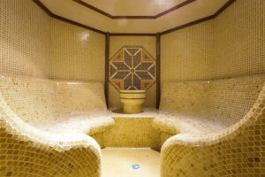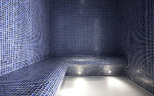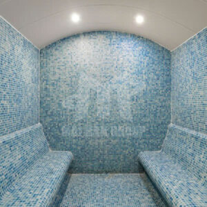 Phòng xông hơi ướt được thiết kế khép kín, thường sử dụng gạch mosaic hoặc kính cường lực với mục đích chống thấm và ngăn chặn sự thoát hơi nước. Trần phòng thiết kế dạng mái vòm giúp tránh tình trạng ứ đọng hơi nước, nhỏ giọt lên người trong quá trình xông. Sàn phòng làm bằng các vật liệu không trơn trượt, có lỗ thoát nước, đảm bảo an toàn cho Khách hàng ở mọi lứa tuổi.